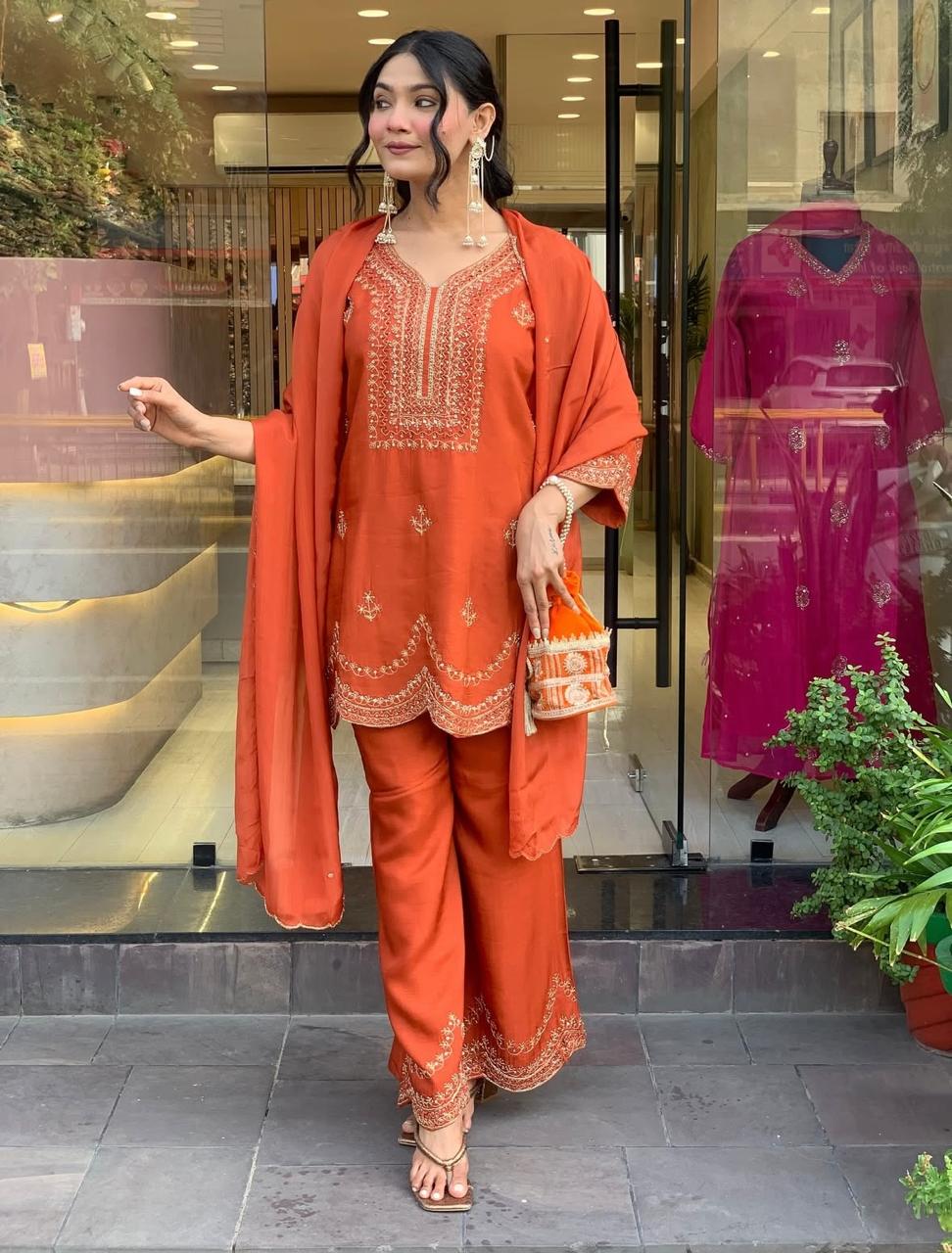 Premium Roman Silk Fully Handwork Kurti Pant Set with Chanderi Dupatta | Festive 3-Piece Suit Set for Women