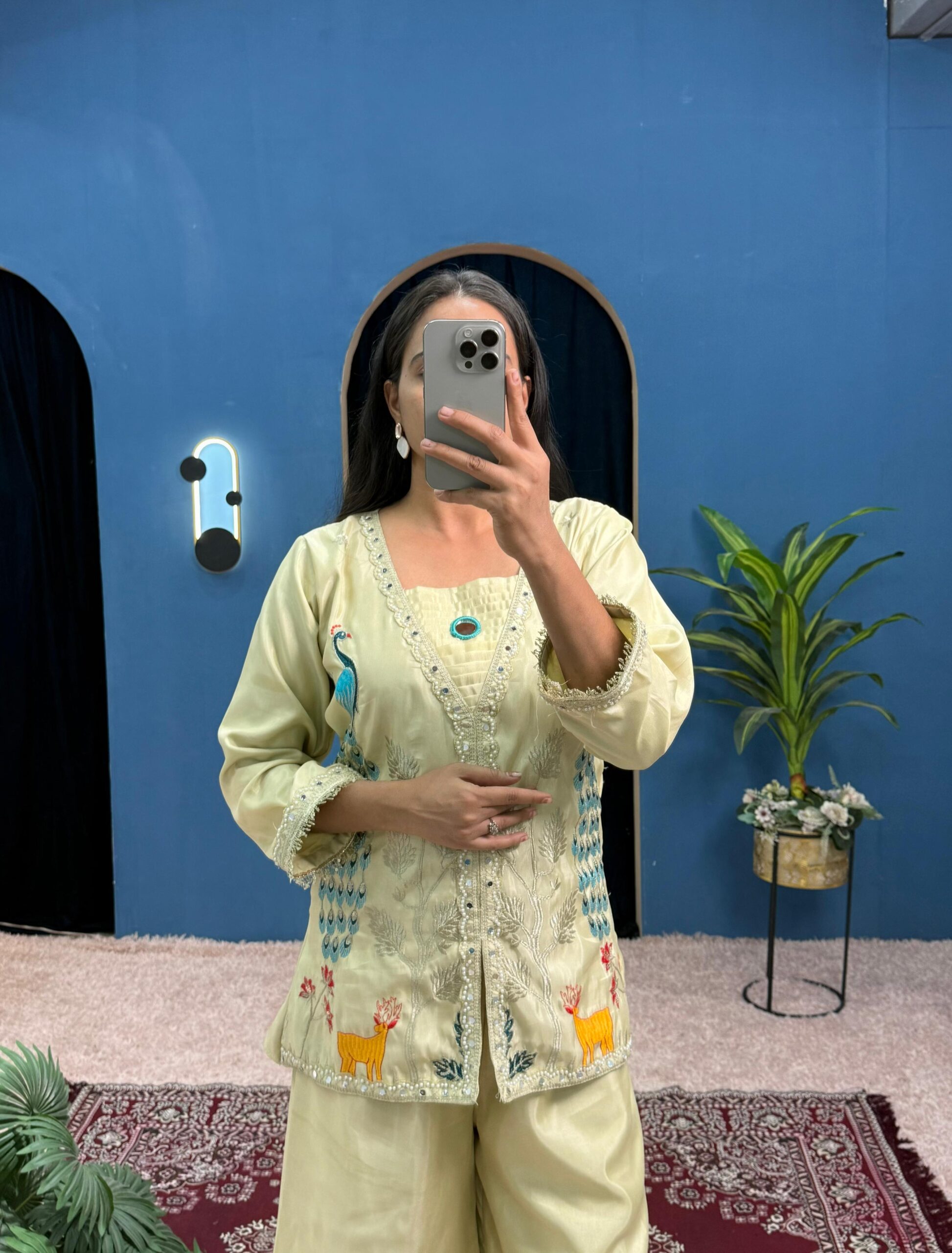 Premium Embroidered Co-Ord Set with Koti | Peacock & Deer Motif | Shimmer Palazzo