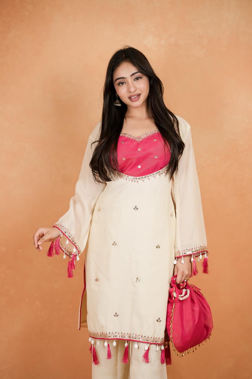 Elegant White Roman Silk Embroidered Suit Set with Pink Yoke